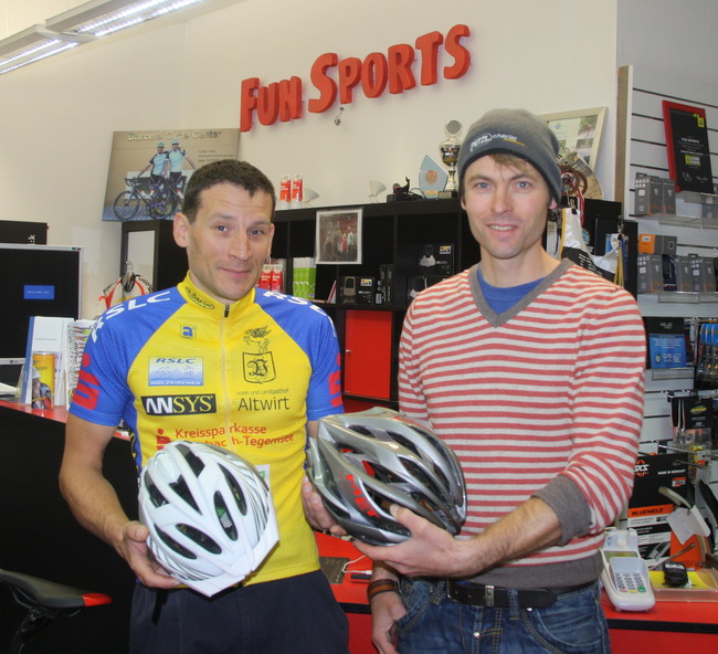 Er spendete zwei Radhelme für den Teambus - einen für Erwachsene und eine Größe für Jugendliche.