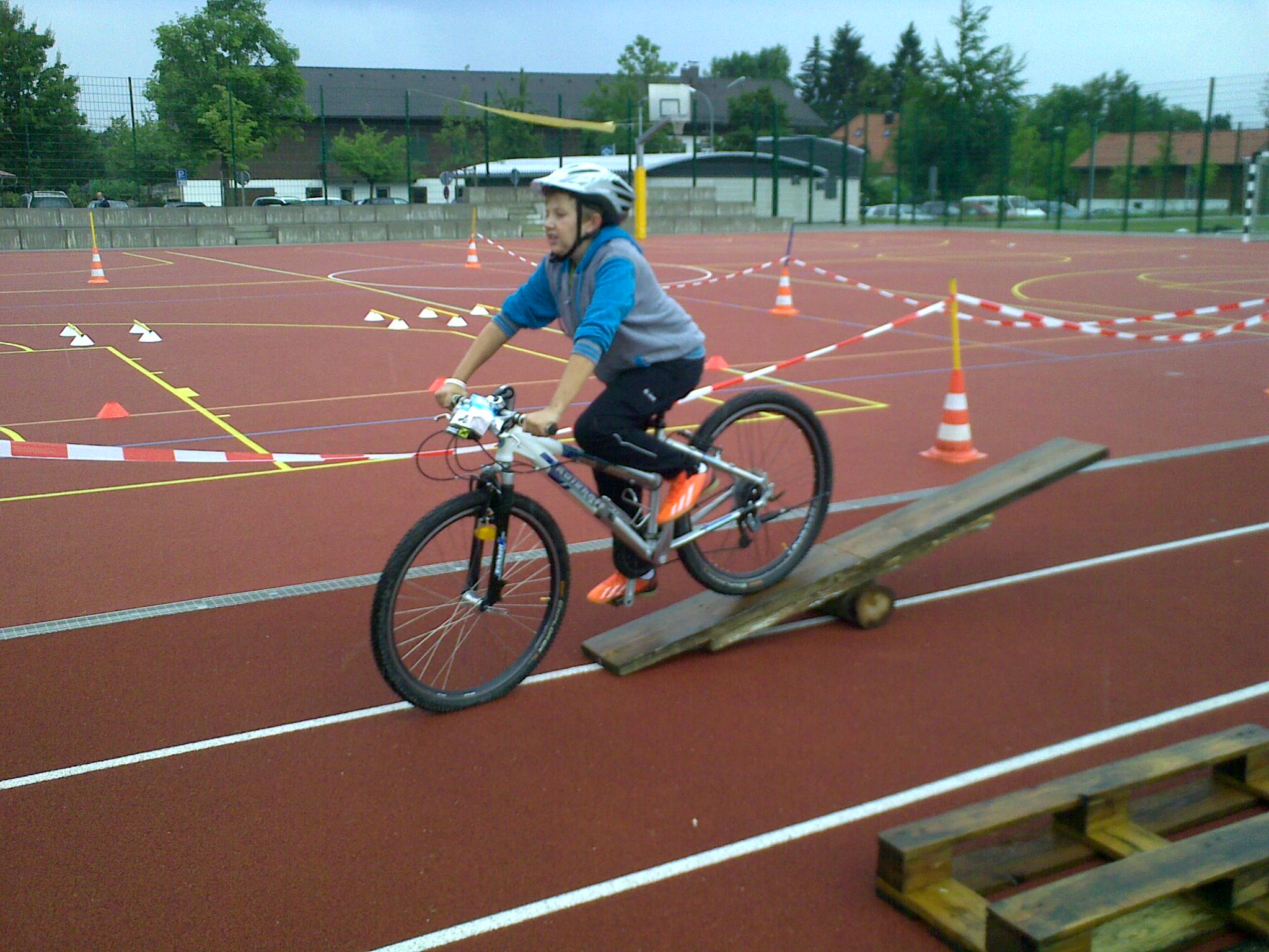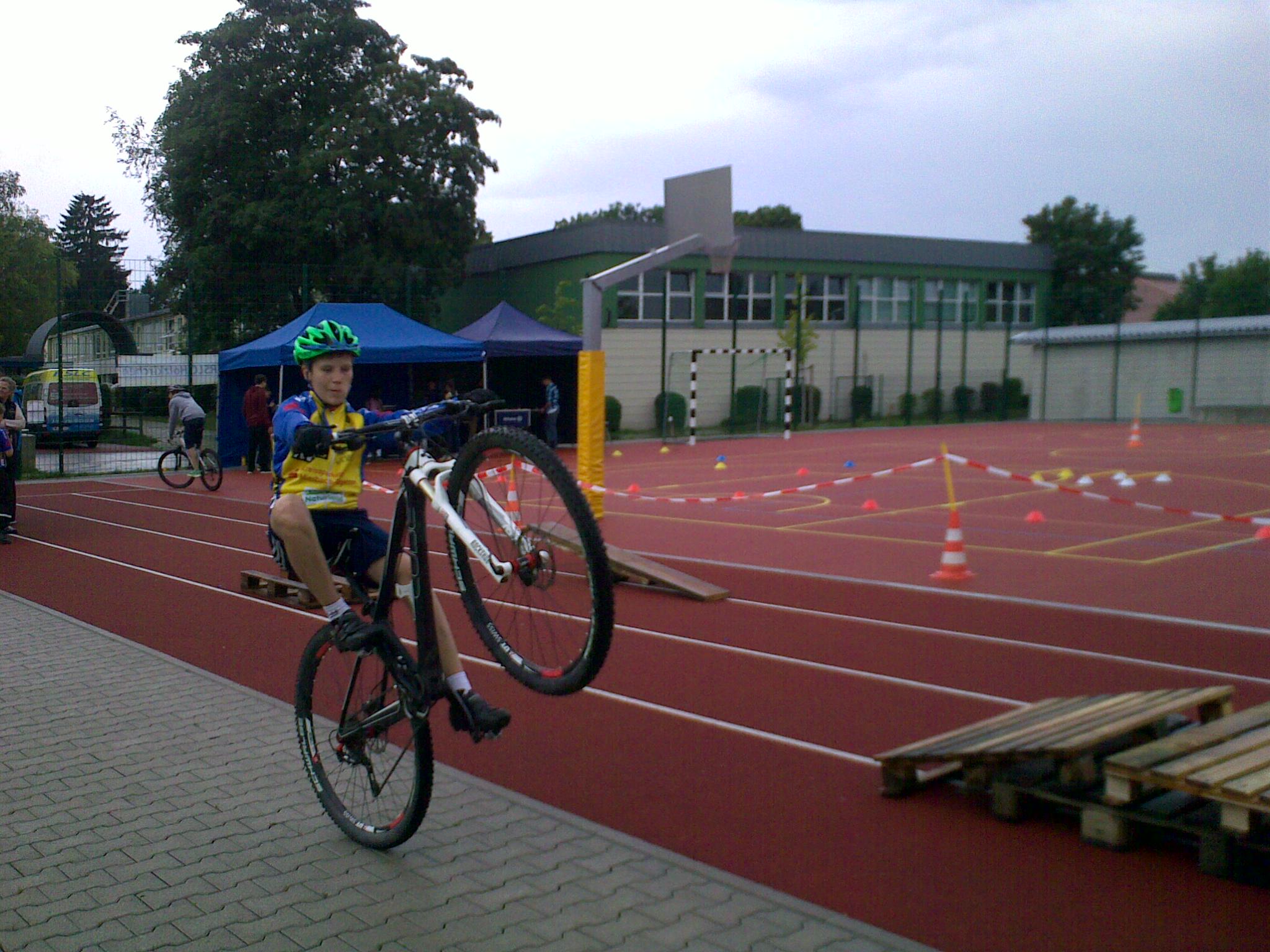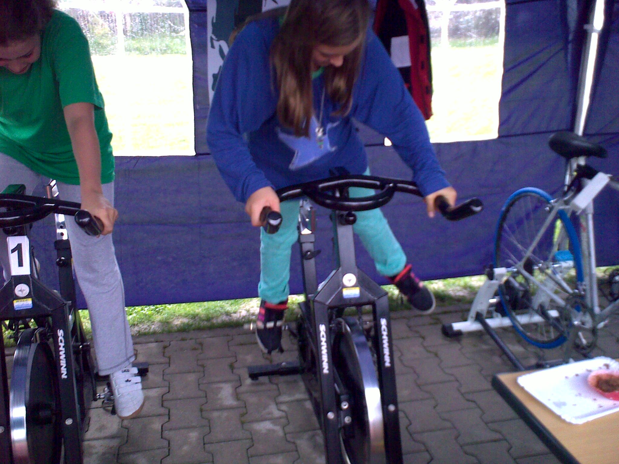 Stefan Jurthe hatte die Präsentation sehr gut vorbereitet. Zwei Pavillons neben der Tartenbahn des Sportplatzes boten Schutz vor den immer wieder niedergehenden Regenfällen. Doch wir hatten stets Besuch von interessierten Schülerinnen und Schülern, die auf zwei Spinningrädern strampeln und einen Rennradsimulator ausprobieren konnten. Auf der Tartanbahn war eine Slalomstrecke mit Hindernisse aus Paletten und einer Wippe aufgebaut. Andauernd versuchten sich Mädchen und Burschen mit den zur Verfügung gestellten MTBs an dieser Strecke. Trotz des Regens war es ein ganz schöner Erfolg.
