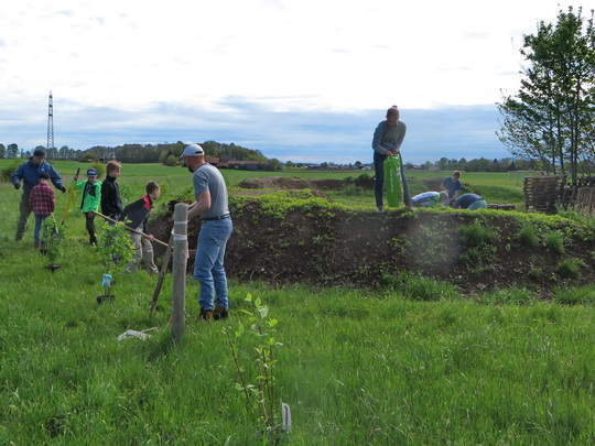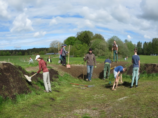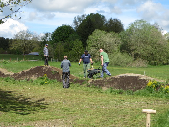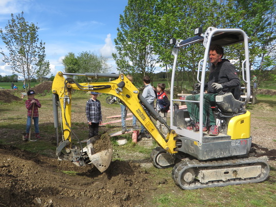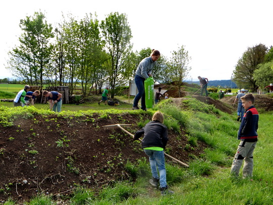 Mehr als 25 Eltern mit ihren Kindern, Trainer beider Vereine, RSLC Holzkirchen und équipe vélo Oberland, fanden sich am Samstag, 13. Mai 2017, um 09:00 Uhr ein, um unter Anleitung des Landschaftsgärtners Alwin Huil die Kids-Bike-Anlage nach dem Winter wieder in Schuss zu bringen. Zur weiteren Stabilisierung der Bahnen wurden die Flanken der Hügel aufgeraut, dünn mit Humus abgedeckt und strapazierfähige Wiesensaat aufgebracht. Außen herum pflanzten wir einheimische Sträucher, um die Kids-Bike-Anlage auch optisch von der Umgebung abzugrenzen. Das frischgewachsene Gras wurde so weit wie möglich gemäht. Zusätzlich verbesserte Alwin mit seinem Minibagger ein paar Stellen der Fahrbahnen, um sie auch für die Trainer, die nicht so wendig wie ihre Schützlinge sind, gut befahrbar zu machen. Schon um 1/2 12 Uhr waren wir mit den Arbeiten fertig, da viele Hände fleißig zugepackt hatten.