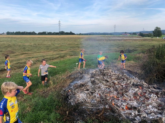 Stefan hatte mit seinen Helfern den Grill aufgebaut und für Getränke gesorgt. Die Würstel und Semmeln waren bald vertilgt. Ein großes Feuer mit ausrangierten Paletten sorgte für zusätzliche Hitze an diesem wunderbar warmen Abend.
