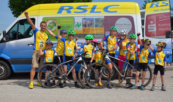 Beim 2. Lauf des Sparkassen Kids Cups am Sonntag, 16. Juni, in Weyarn war der RSLC unter Leitung von Barbara Kaltenhauser und Thomas Meck mit 12 Kids und Jugendlichen vertreten. Das Foto zeigt 10 davon vor dem neugestalteten RSLC Teambus.