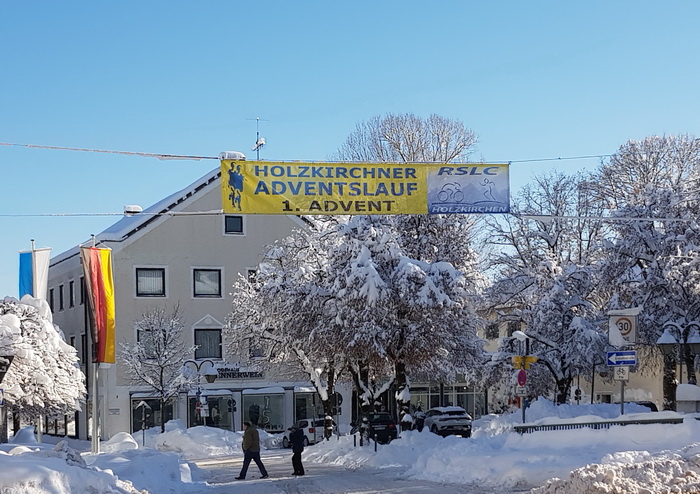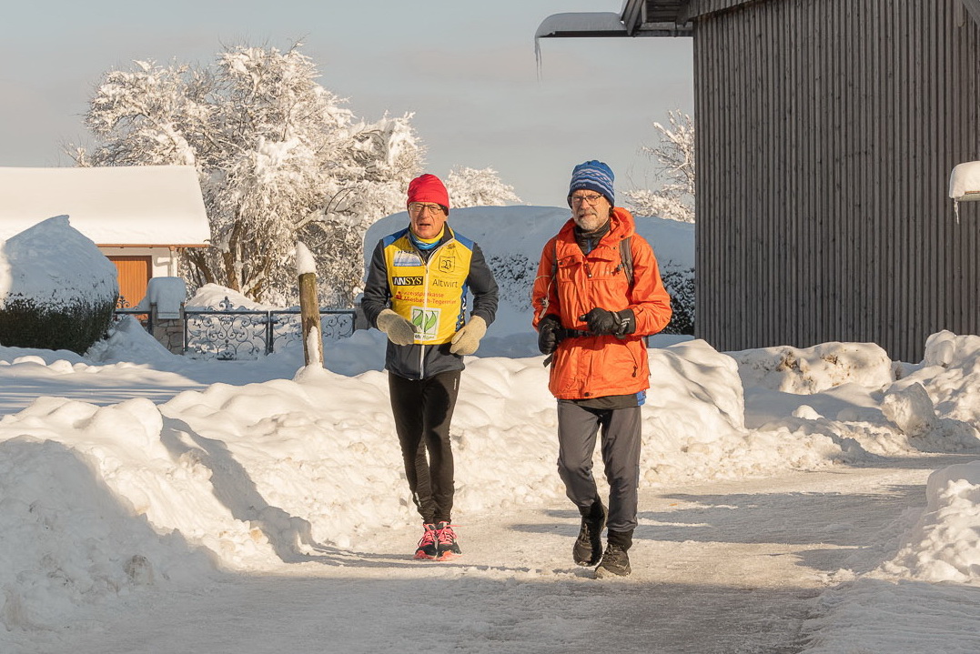 In den letzten drei Tagen hatte es so viel geschneit wie schon lange nicht mehr. Darum beschlossen die Organisatoren des Adventslaufs um Wilfried Hackenbroich, die Laufstrecke wegen der Schneebruchgefahr nicht durch den Wald nach Buch zu führen, sondern nach Roggersdorf. Auf den tief verschneiten Straßen hatte es ohnehin sehr wenig Autoverkehr.