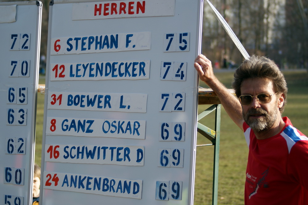 Rainer Leyendecker, vor Wochenfrist noch mit 3:34:37 h Deutscher Meister der M55 über 50 km, war am Ende nicht zufrieden mit seinen 75,029 km, die ihm den zweiten Gesamtrang und die Sieg bei den Senioren I (50-59 Jahre) sicherten. Rainer führte souverän das Feld von knapp 160 Läufer/innen bis über die Marathon-Distanz an, musste dann aber Tempo rausnehmen und den späteren Sieger Frank Stephan aus Frankfurt passieren und davonziehen lassen. Der siegte mit 76,399 km, während Rainer Zweiter mit 75,029 km wurde. Das bedeutet fast 49,5 Runden mit einem Schnitt von 4:48 min/km bzw. 12,5 km/h. „Das war der schlechteste 6-er meiner Laufbahn“ haderte der 55jährige Holzkirchener mit seinem Schicksal. Seit Beginn seiner Ultra-Laufbahn im Mai 2009 war das nun seine 21. Veranstaltung. Am kommenden Wochenende will er nur deshalb keinen Ultra laufen, weil es keinen in gut erreichbarer Nähe gibt. Aber in 14 Tagen darf’s dann wahrscheinlich der 50-Kilometer-Lauf von Eschollbrücken sein, den er mit einem Besuch bei seinen Eltern im Saarland verbinden will. Dennoch lief er einen sicheren Vorsprung vor dem Dritten, Ludger Böwer, heraus, der mit seiner Familie in Italien lebt, aber in Deutschland arbeitet, mit 72,978 km.