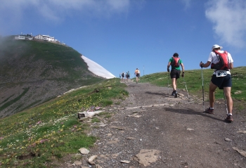 Nach fast 10 Stunden Arbeit mit vielen für Rainer nicht laufbaren Passagen war hier die Möglichkeit zum Umziehen und Nudelessen vor einem langen und anspruchsvollen Auf- und Abstieg nach Wengen. Von dort war die 1.000 m hohe Steilwand hinauf zum Männlichen-Gipfel in Serpentinen zu bewältigen. Doch plötzlich zog sich der Himmel rasch zu. Als sich die ersten Gewitter zusammenbrauten, war Rainer mit einigen Mitläufern schon vor den eisernen Lawinenschutz-Zäunen unterwegs und schaffte es trotz Wettersturz mit bedenklichem Gewitterregen im Wolkennebel bis zur Bergstation auf 2.300 m. 14 Stunden Arbeit für nur 68 km, aber immerhin 5.200 Höhenmeter - ein neuer Rekord für ihn!