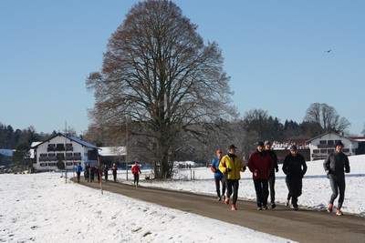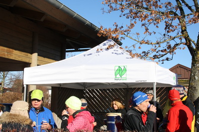 Es war ein wunderschöner Wintertag mit herrlichen Blicken auf die Berge. Knapp 60 Teilnehmer gingen am 01. Dezember am Batusa auf die 10-Kilometer-Strecke, die durch leicht bereifte Wälder und etwas verschneite Wiesen auf der umgekehrten Marktlaufrunde über Kleinhartpenning, Buch und zurück nach Holzkirchen ans Batusa führte. Zur Hälfte der Strecke gab's in Kleinhartpenning bei einem kurzen Zwischenstopp heißen Tee. Am Ziel der Laufstrecke konnten sich die Läufer mit heißem alkoholfreiem Punsch, Stollen und Lebkuchen stärken, die von Michael Stienen für Naturland gespendet und aufgebaut worden waren.