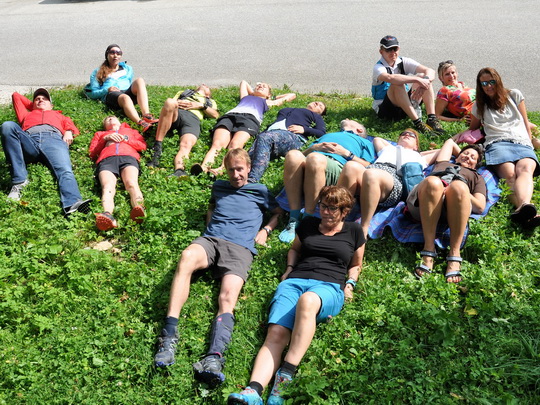 Für den Ankunftstag stand eine Aufwärmtour von maximal 2 Stunden auf dem Programm. Der größere Teil der Gruppe ließ nicht von der Kombination eines relativ steilen Anstiegs in der Sonne bei hochsommerlichen Temperaturen abschrecken und lief hinauf zur Binsalm  in 1.502 m Höhe. Eine kleinere Gruppe wählte die flachere Variante über die Engalm entlang des Baches hinein in den Enger Grund – doch auch hier wurden die Trinkflaschen mehrfach nachgefüllt.