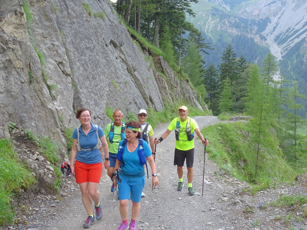 Für die Tour am Sonntag waren wir dann nur noch zu siebt unterwegs. Bei etwas kühleren Temperaturen und vielen Wolken am Himmel ging es diesmal für alle im Wanderschritt auf unterschiedlich langen Wegen hinauf zur Lamsenjoch-Hütte. Der gemeinsame Abstieg war für den Teamgeist super. Zu guter Letzt kam dann auch noch der angekündigte Regen, so dass wir auf den letzten Metern noch nass bis auf die Haut wurden.