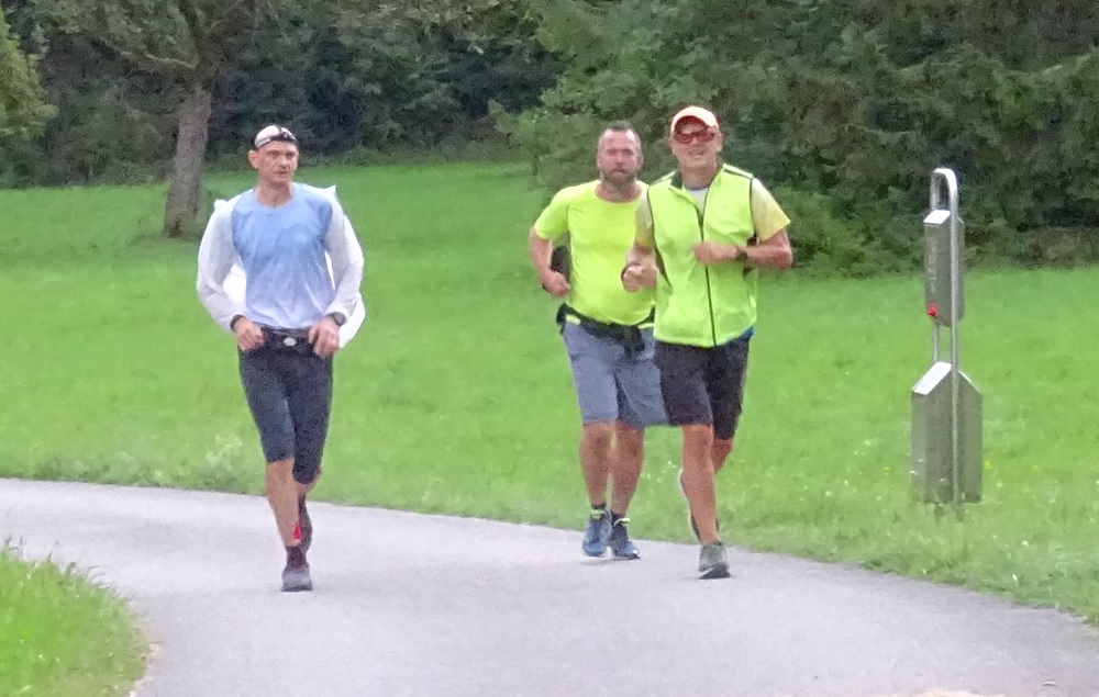 Das Wetter sah zunächst gar nicht gut aus. Bei Abfahrt in Holzkirchen begann es bereits zu regnen. Aber - wie über die gesamten 11 Trainings-Wochen - hatten wir mal wieder enormes Glück. Von 18:30 bis kurz vor 20:00 blieb es trocken, und so schafften es die meisten noch vor dem wieder einsetzenden Regen ins Ziel.