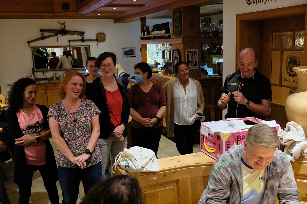 Als alle glücklich im Ziel angekommen waren, gab es erst mal Getränke und Süßigkeiten als Zielverpflegung. Später kehrten wir alle gemeinsam beim "Schützenwirt" zum Essen ein. Dort überraschten die Teilnehmer ihre Betreuer mit rührenden Dankesworten, einer Karte, Rosen und Süßigkeiten. Im Gegenzug erhielten die Lauf10!-Teilnehmer eine ganz besondere Lauf10!-2020-Tasse als Erinnerung.
