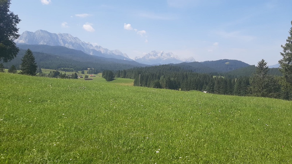 Nun nahmen wir die letzten 25 Kilometern dieses Marsches in Angriff. Das klingt jetzt relativ überschaubar, aber wenn man schon 75 Kilometer in den Beinen hat, ist die Aussicht, weitere 25 Kilometer gehen zu müssen nicht sonderlich erhebend. Unser Weg führte uns entlang am schon fast kitschig-schönen Walchensee, der umgeben von Bergen in goldener Morgensonne lag. Weiter ging es nach Wallgau und von da aus weiter bis Krün. Der letzte Abschnitt zwischen Krün und Mittenwald sollte sich noch als die allergrößte Herausforderung des ganzen Marsches herausstellen. Denn ab hier gingen wir nur noch in praller Sonne, kein Schatten weit und breit. Und um das Vergnügen noch zu steigern, ging die Strecke immer wieder bergauf und bergab. Unsere Füße schmerzten nun mit großer Vehemenz und das Ziel erschien uns in schier unerreichbarer Ferne. Aber wir gingen einfach immer weiter. Es ging durch die Buckelwiesen bei Mittelwald, noch immer in gnadenloser Sonne bei Temperaturen von über 30 Grad. Etwas entschädigt hat uns dabei das an diesem Tag absolut atemberaubende Bergpanorama...