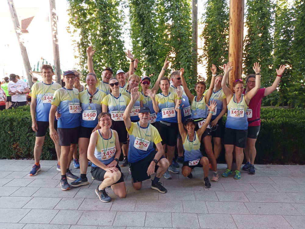 Der RSLC war mit 19 Läufern angereist. Mit dem RSLC-Bus und mehreren Fahrgemeinschaften ging es um 13:30 in Holzkirchen los. Gegen 15:00 trafen wir in Wolnzach ein und parkten die Autos am Schwimmbad. Nachdem alle umgezogen waren, ging es gemeinsam zum Stadion. Zum Glück fanden wir dort ein schattiges Plätzchen, wo wir die Zeit bis zur Startaufstellung verbringen konnten. Als die Startnummern an den Shirts befestigt waren, gab es ein kleines Aufwärm-Programm und dann ging es auch schon an den Start.