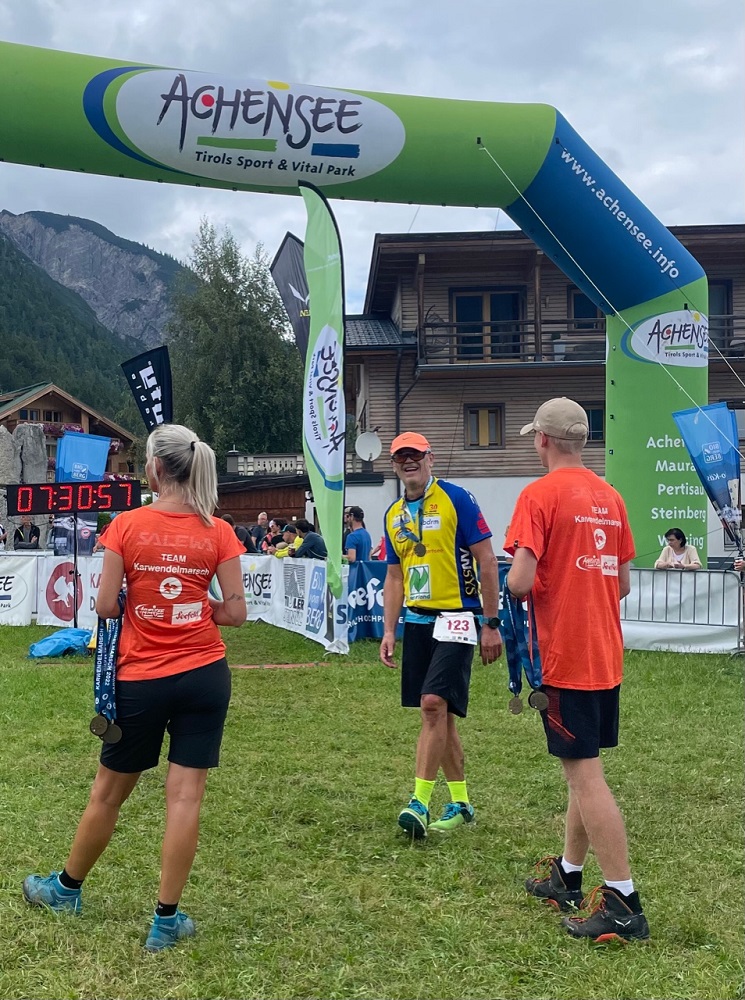 Nachdem im letzten Jahr für Nic (Nicolaus Spinner) nach einem Sturz in der Eng Schluss war, wollte er heuer natürlich bis Pertisau laufen. Wir freuten uns über seine Ankunft nach 7:30:36.