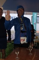 Verletzungsbedingt war für Willi Neureither dieses Jahr kein Laufen möglich. Um trotzdem dabei sein zu können hat er sich entschieden die Strecke zu erwandern. Gesagt getan – ankommen ist alles – klatsch nass aber glücklich erreichte er das Ziel um 16:54:55 und wurde, wie auch alle RSLC Teilnehmer, mit Sekt von uns belohnt.