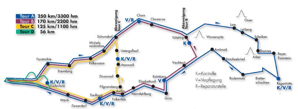 Oder war' s doch zuviel? Denn direkt nach dem Weiterfahren bin ich rechts abgebogen, anstatt gerade aus zu fahren. Die Streckenposten an der Kreuzung sagten aber nichts. Warum, weiß ich nicht; ich hab einfach das "Geradeaus-Schild" übersehen. Erst nach ungefähr 10 Kilometern kam mir das spanisch vor; keiner vor mir, keiner hinter mir, keine Polizei-Begleitmotorräder, keine Schilder - "ich hab mich verfahren, das stand jetzt fest!" "Zurück oder stramm voraus?", dachte ich mir. "Natürlich immer nach vorn', keine Frage - des gähd' scho'!". Zu Beginn meines Abstechers gleich mal ein längerer 14%iger Berg über ein paarhundert Meter, weiterhin berauf, bergab, bergauf, bergab.....irgendwann hab ich mich selbst ausgelacht für soviel Dummheit, einen Wegweiser zu übersehen; aber das motivierte mich nur noch stärker. Nun war ich ganz allein, mitten in einer einsamen, unbekannten Landschaft, kleine Dörfer, keine (!) Menschen auf der Straße, keine Landkarten....Ich hoffte auf einen Wegweiser nach Regensburg - endlich: "Regensburg 38 Kilometer". Diese Richtung schlug ich ein und kam irgendwann mal wieder auf die Strecke der Hinfahrt über Falkenstein nach Regensburg zurück auf den Dultplatz in' s Ziel.