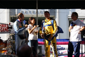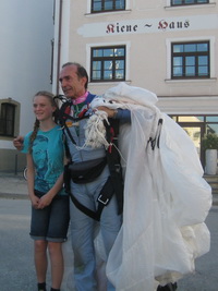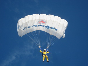Der Fallschirmsprungweltmeister und der ehemalige Reckweltmeister Eberhard Gienger legten eine punktgenaue Landung nach dem Absprung aus 1.000 Meter Höhe hin.