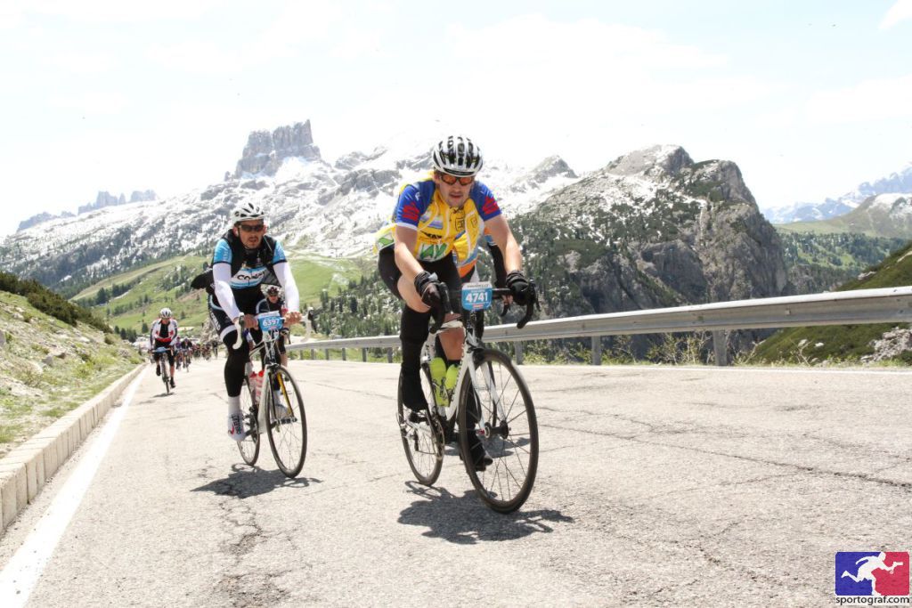 Eine Woche nach dem harten MTB-Rennen Sella Ronda Hero startete am 30. Juni der berühmte Maratona dles Dolomites auf der Straße. Nach dem Start in La Villa im Badiatal geht's zuerst über Campolongo Pass (1.875 m) , Pordoijoch (2.239 m), Sellajoch (2.240 m) und Grödner Joch (2.121 m) mit der brutalen Abfahrt durch Colfuschg nach Corvara rund um den Sellastock. Dann gilt es den Campolongo ein zweites Mal zu erklimmen, Gott sei Dank, der leichteste der Pässe. In Cerdanoi muss man sich entscheiden, ob man die mittlere Runde mit 106 Kilometern und 3.090 Höhenmeter wählt und sofort auf den Falzarego (2.117 m) klettert oder noch den steilsten und normalerweise heißesten Pass, den Giau (2.236 m) mit der Superabfahrt nach Pocol oberhalb von Cortina d'Ampezzo mitnimmt und die lange Runde mit 138 Kilometern und 4.190 Höhenmetern fährt. Der Valparola (2.220 m) ist dann nur noch ein Kinderspiel, bevor es die lange Abfahrt Richtung La Villa und ins Ziel in Corvara geht.