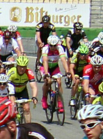 Nach 3 Runden hatte Willi seine Linie gefunden und versuchte kraftsparend im hinteren Drittel der Gruppe dran zu bleiben. Das hatte den Nachteil, immer mit Bremsen und Antritten auf die Bewegungen im Feld reagieren zu müssen. Irgendwann passierte es dann auch. Sturz mitten im Feld, Willi war am Rand und konnte ausweichen. Uff! Glück gehabt. Nach der Hälfte des Rennens war er immer noch vorn dabei. Im Vorjahr war er schon einmal überrundet worden. Zu diesem Zeitpunkt wurde auch Platz auf der Strecke. Die 60-Kilometer-Distanz kürte ihren Sieger und verschwand vom Kurs. Eigentlich hatte Willi ab jetzt mit erheblicher Tempoverschärfung gerechnet, wenn das bei 44-45 km/h noch möglich ist. Das Feld zerlegte sich jedoch weiter. Er immer noch in der etwa 140 Mann starken Spitzengruppe.