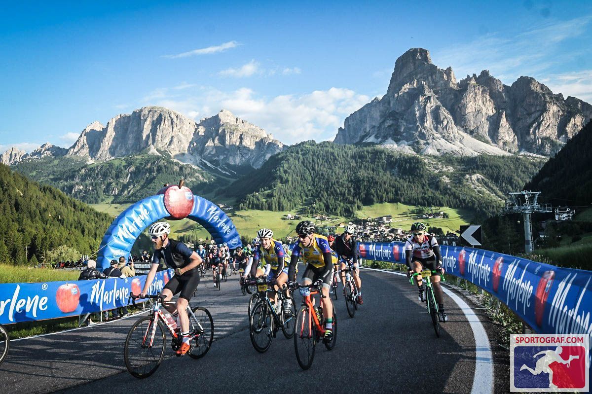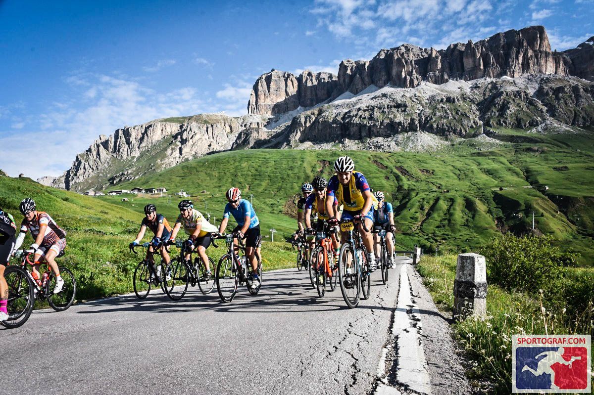 Beim Dolomiti gilt es nach dem Start in La Villa vor Corvara den Campolongo Pass (1.875m), den Pordoipass (2.239m), das Sellajoch (2.244m), das Grödnerjoch (1.871m), noch einmal den Campolongo, den Passo di Giau (2.236m), den Falzarego Pass 2.117m) und den Passo Valparola (2.200m) zu bezwingen und das Ziel in Corvara zu erreichen.