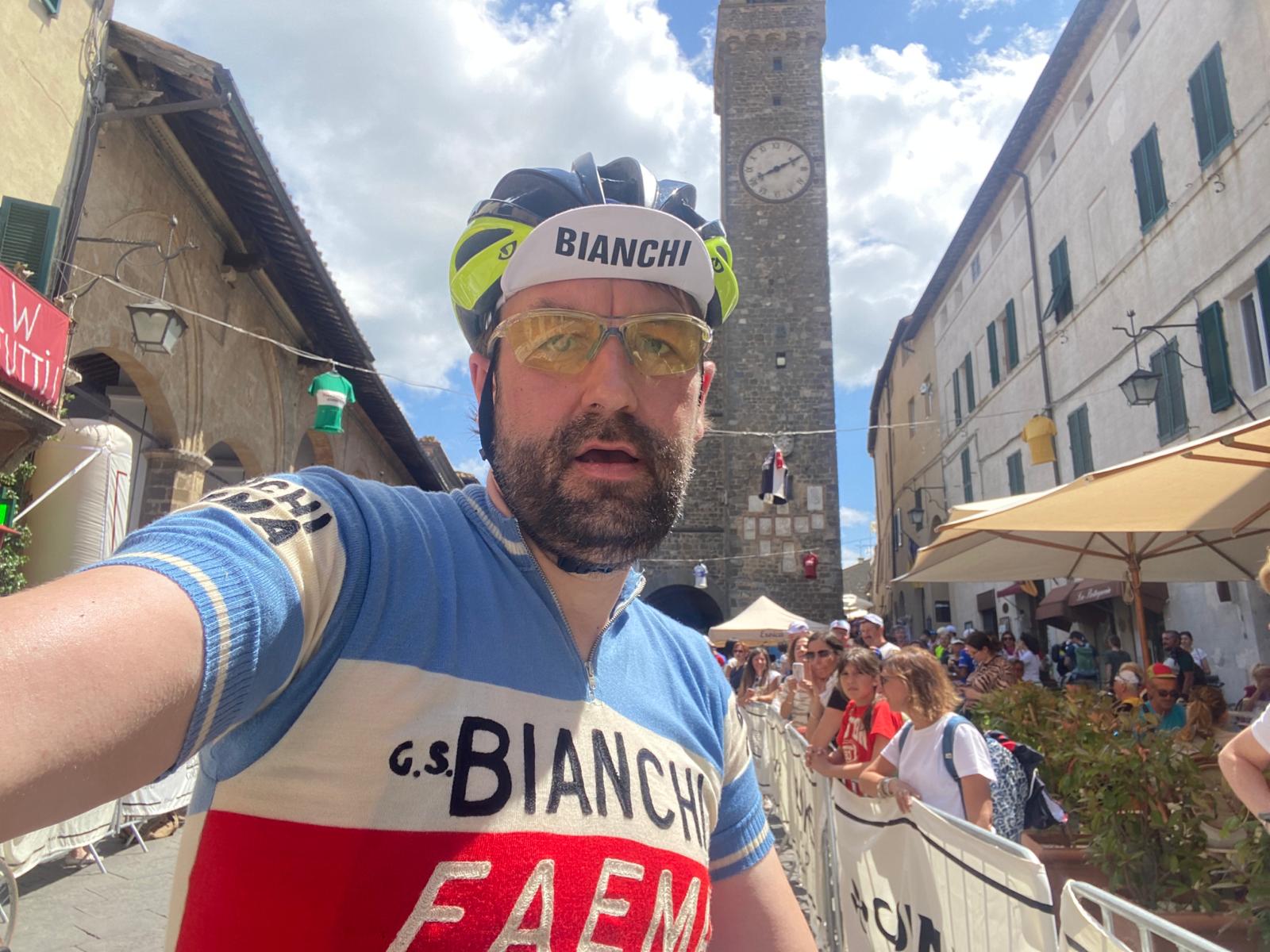Jochen schreibt: "Inzwischen bin ich seit 5 Jahren von der Leidenschaft alter Räder infiziert. Nach der L‘ Eroica im Oktober wollte ich dieses Jahr die Toskana mal in grün sehen und so war die Idee der Eroica Montalcino geboren. Die Strecke mit 96 km und ca. 1.900 hm war sehr schön und an einer Stelle mit 15 % Steigung auf der Strade Bianche sehr anspruchsvoll. Eine rundum gelungene Veranstaltung!"