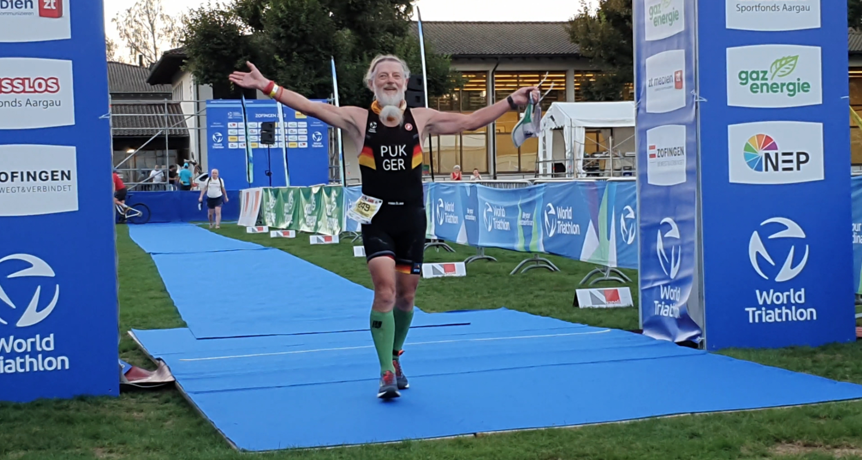 Konrad Puk krönt seinen 100. Start bei der Weltmeisterschaft im Duathlon mit einer Bronzemedaille in seiner AltersklasseSeit 1989 treffen sich im September die weltbesten Duathleten beim POWERMAN in Zofingen in der Schweiz. Bei der Weltmeisterschaft im Langdistanz Duathlon sind zuerst 10 km zu Laufen, danach 150 km Rad zu Fahren und zum Abschluss nochmal 30 km zu Laufen. Die malerischen Strecken im schweizerischen Voralpenland führen über legendäre und anstrengende 2400 Höhenmeter. Dieses Jahr traten am 04. September zur WM ca. 120 Athleten aus ca. 20 Ländern an, um in ihren Altersklassen von 20 bis 75+ Jahren ihre Weltmeister zu küren.