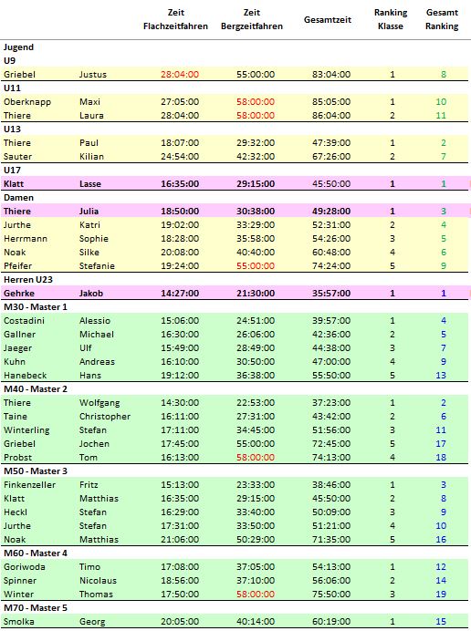 Überragender Sieger und damit Vereinsmeister war wie in den beiden Vorjahren Jakob Gehrke mit einer Flachzeit von 14:27 min und einer Bergfahrzeit von 21:30 min auf die Gindelalm, gefolgt von Wolfgang Thiere in 22:53 min und Fritz Finkenzeller in 23:33 min am Berg.