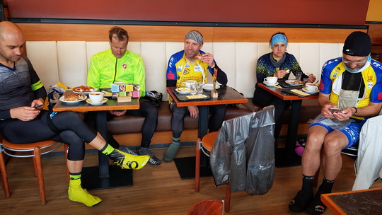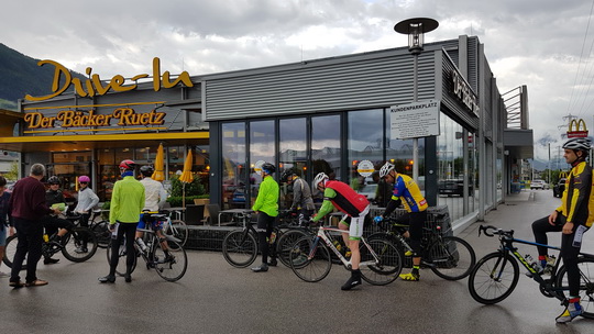 Denn es regnete weiter bis zur Frühstückspause beim Bäcker Ruez in Vomp.