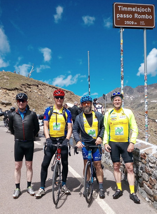 Gemeinsam kämpften wir uns dann bei angenehmen Temperaturen im Genußmodus von Sölden aus über Ober- und Hochgurgel und von Kehre zu Kehre der 2.509m hoch gelegenen Passhöhe entgegen. Oben angekommen und nach einer kurzen Pause sowie getrieben von der Euphorie die knapp 1.300hm bewältigt zu haben (wahrscheinlich spielte auch der höhenbedingte Sauerstoffmangel eine gewisse Rolle…), wurde auf der Passhöhe kein U-Turn vollzogen, sondern die Truppe setzte ihre Fahrt gen Süden fort und „stürzte“ sich bei rasanter Fahrt die spektakulären Kehren Richtung St. Leonhard hinunter. Je nach Leistungslevel und Lust ging die Abfahrt unterschiedlich weit hinunter. Eine 5er Gruppe fand sich dann sogar ganz unten in St. Leonhard wieder in einem schönen Cafe bei sommerlichen 27 Grad. Die anschließende Bewältigung der bis zu 1.800hm ging dann nicht mehr ganz so rasant, wurde aber mit gleichbleibender Euphorie bewältigt. Das Timmelsjoch wurde ein zweites Mal erobert.